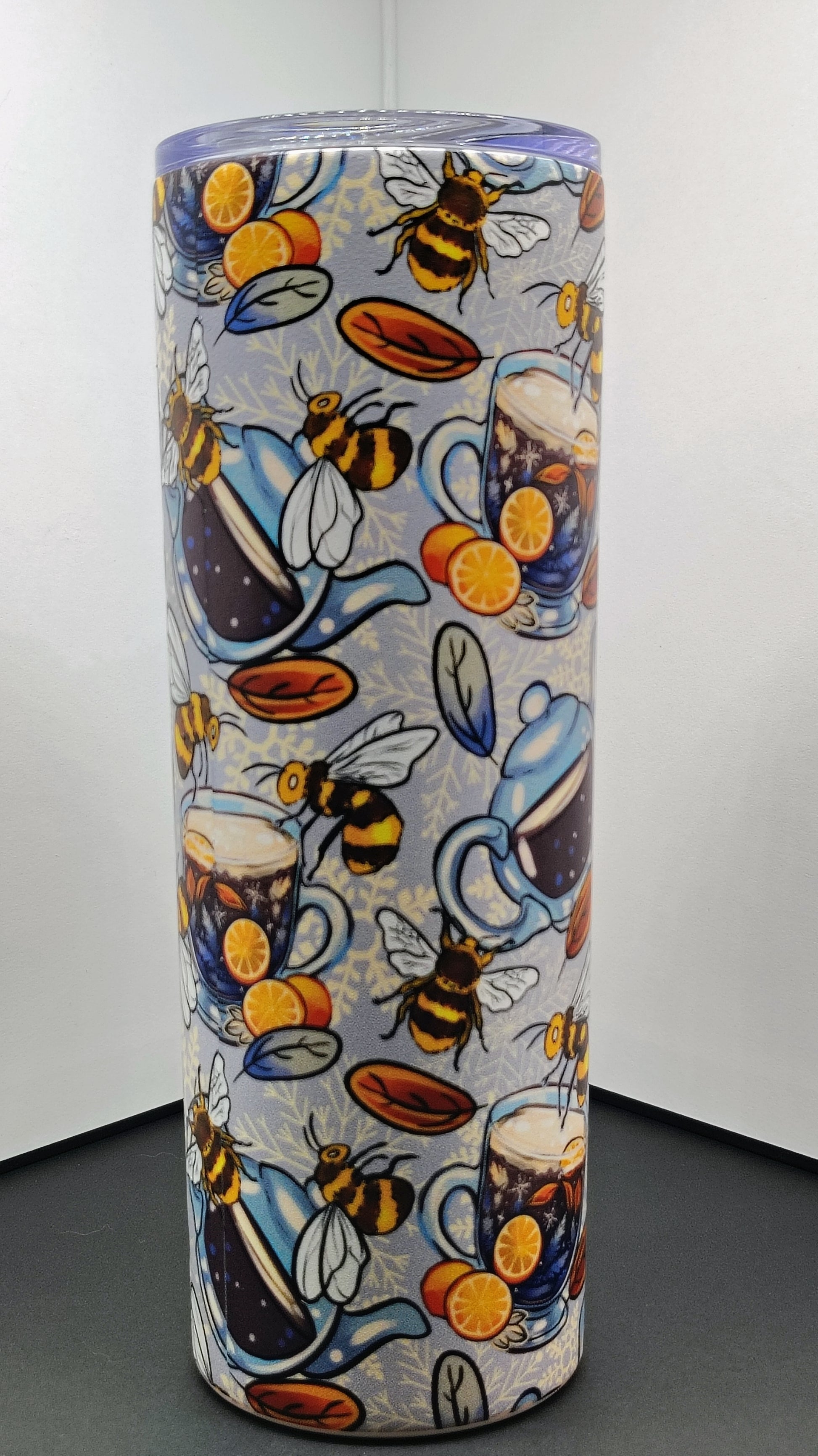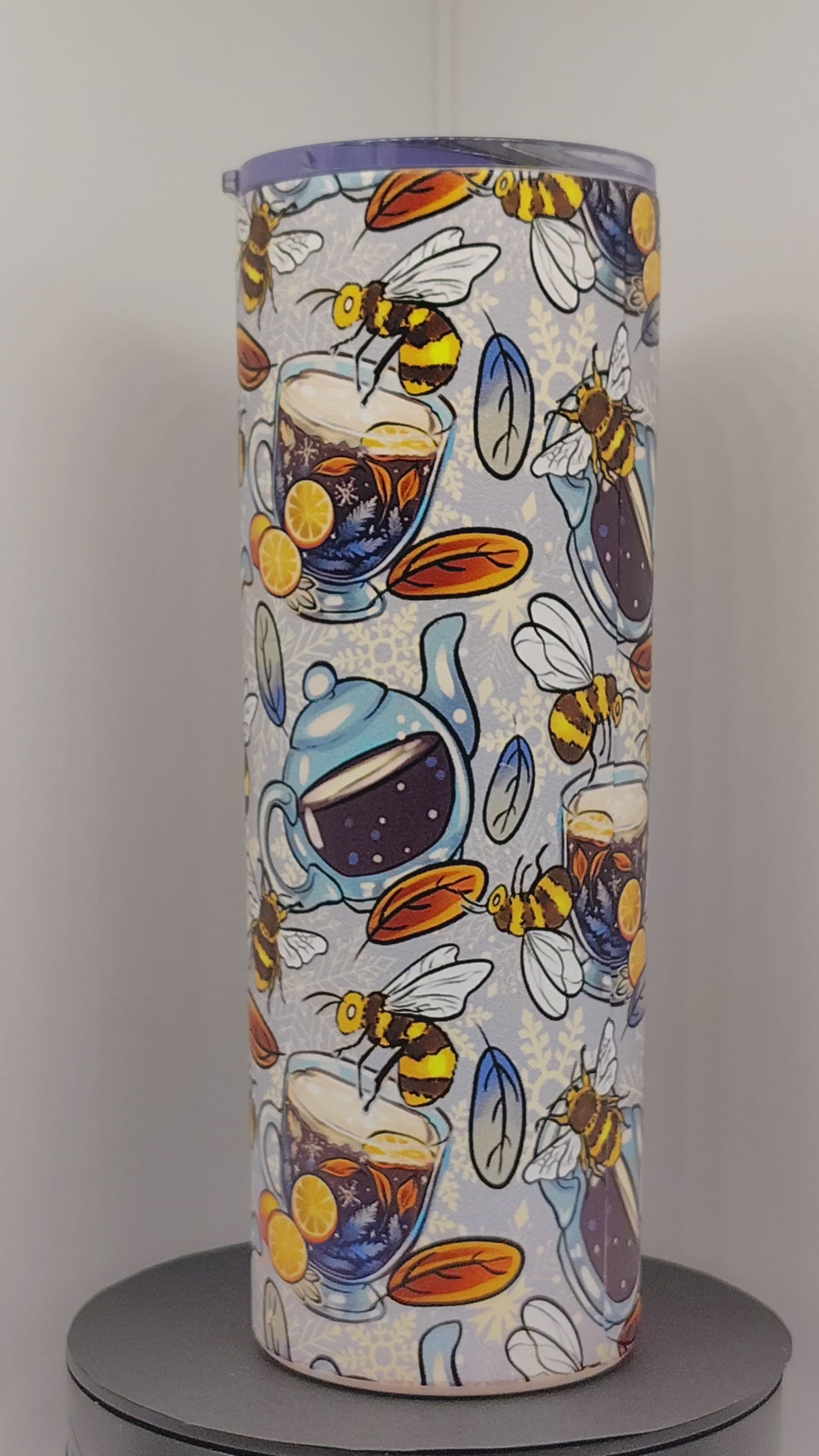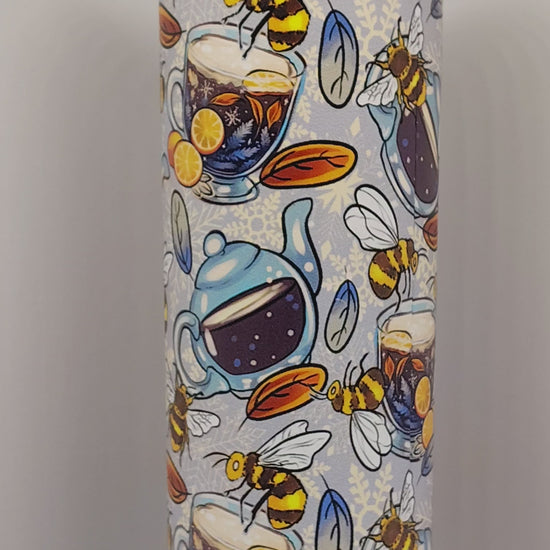 Brighten up your day with our Bee Sweet Brew 20 oz Tumbler! Featuring a lively pattern of buzzing bees, cozy teapots, colorful leaves, and refreshing drinks garnished with orange slices, this tumbler brings a whimsical charm to every sip. Crafted for both hot and cold beverages, it's perfect for tea lovers, coffee enthusiasts, and anyone who enjoys a touch of nature’s sweetness. The durable design ensures your drink stays at the perfect temperature, while the vivid artwork adds a cheerful touch to your daily routine.
