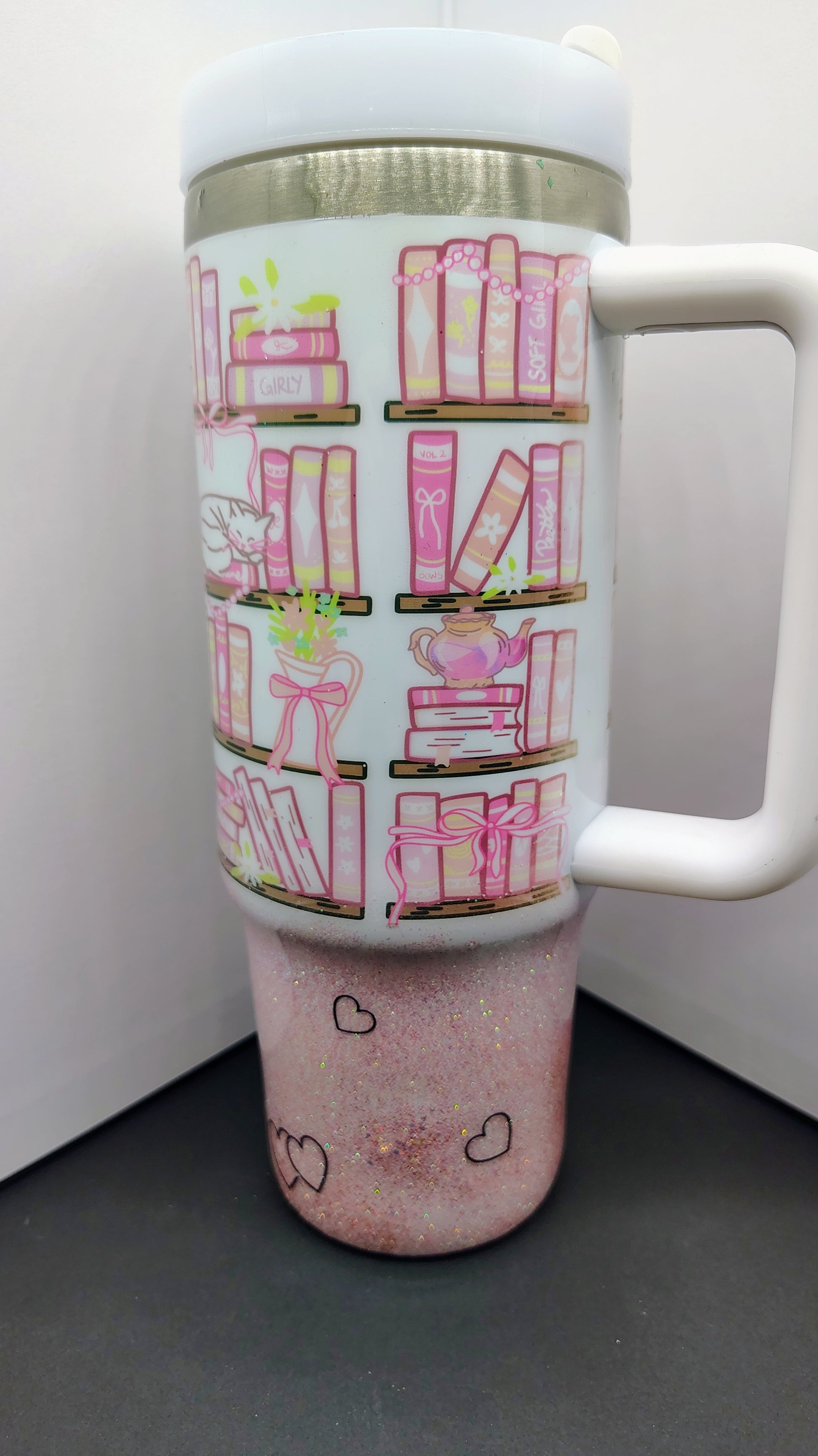 Curl up with your favorite read and sip in style with the Just One More Chapter 40oz Tumbler – a dreamy drinkware essential for every book lover! Wrapped in pastel pink bookshelves and shimmering with soft glitter, this tumbler features charming bookshelf illustrations, cozy vibes, and the iconic quote “Just One More Chapter.” It's not just cute – it’s practical too! With a large 40oz capacity, ergonomic handle, and a spill-resistant lid, this tumbler keeps your drinks hot or cold through every plot twist.
