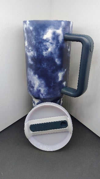Make a bold statement with the Midnight Storm 30 oz Tumbler—a stylish and functional drinkware essential. Wrapped in a mesmerizing blue and white tie-dye design, this tumbler channels the energy of a stormy sky while keeping your beverages hot or cold for hours. Featuring a sturdy ergonomic handle for easy carrying and a secure sliding lid to prevent spills, it’s perfect for on-the-go use. Whether you're sipping coffee during your morning commute or staying hydrated on an adventure, this tumbler combines style, durability, and convenience in one striking package. Ideal for gifting or adding flair to your personal collection.