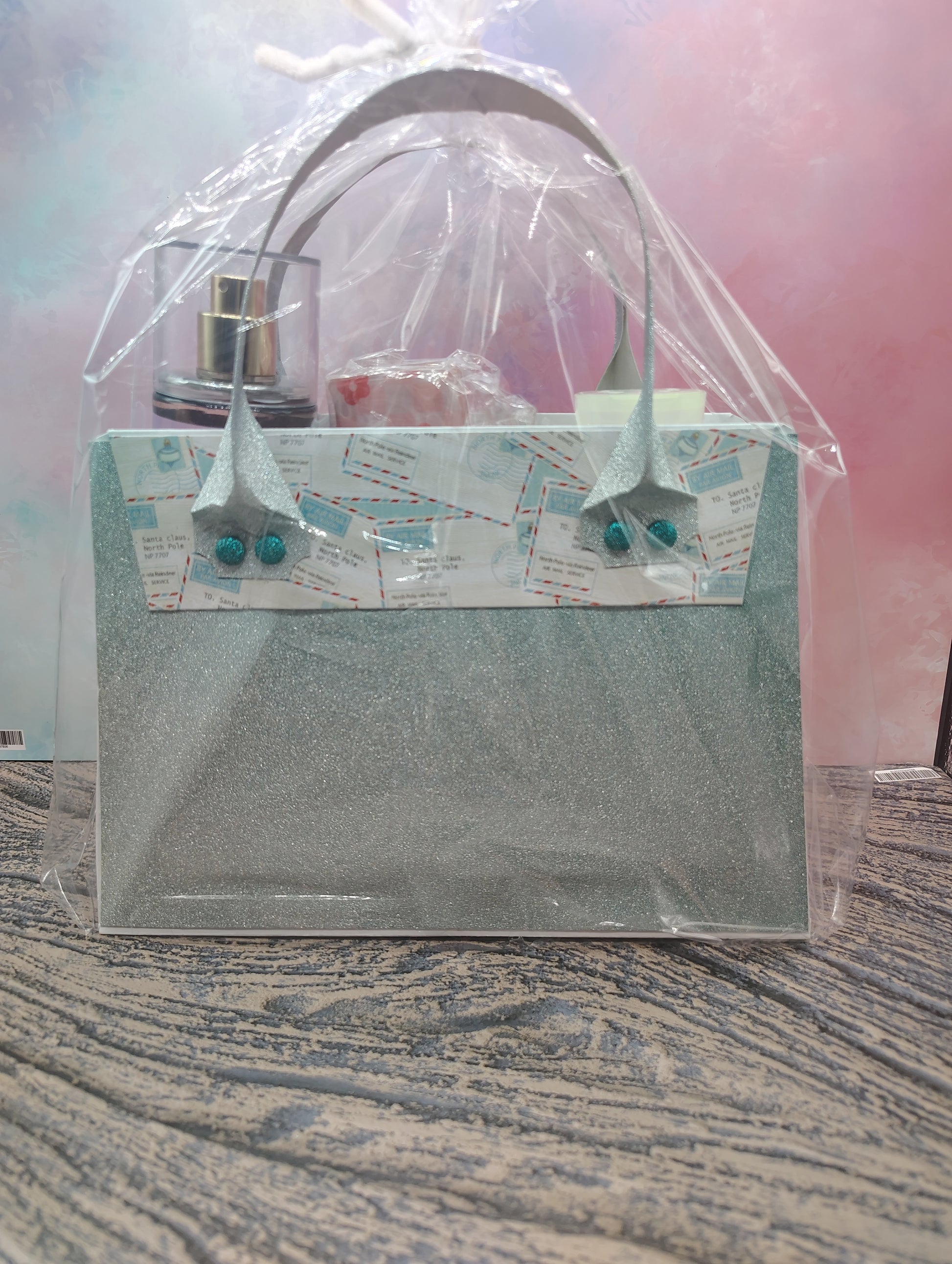 This handcrafted papercraft purse shines with glittery silver accents and a festive snowflake charm, making it as beautiful as the treasures inside. Filled with indulgent body care and playful accessories, it’s the perfect way to treat yourself or surprise someone special.